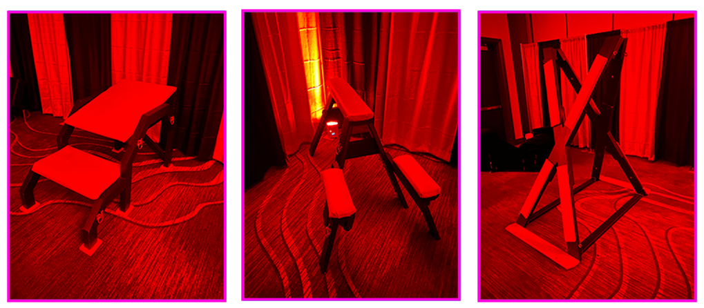 Our comfortable and inviting space features a Double Saint Andrews Cross, Whipping Post, Multiple Spanking Benches, and all the implements to enjoy them to the fullest! With seminars and sessions hosted by professionals from throughout the kink community and vendors specializing in floggers, restraints, & more, the Dungeon Experience at Xcapades has everything you need!
