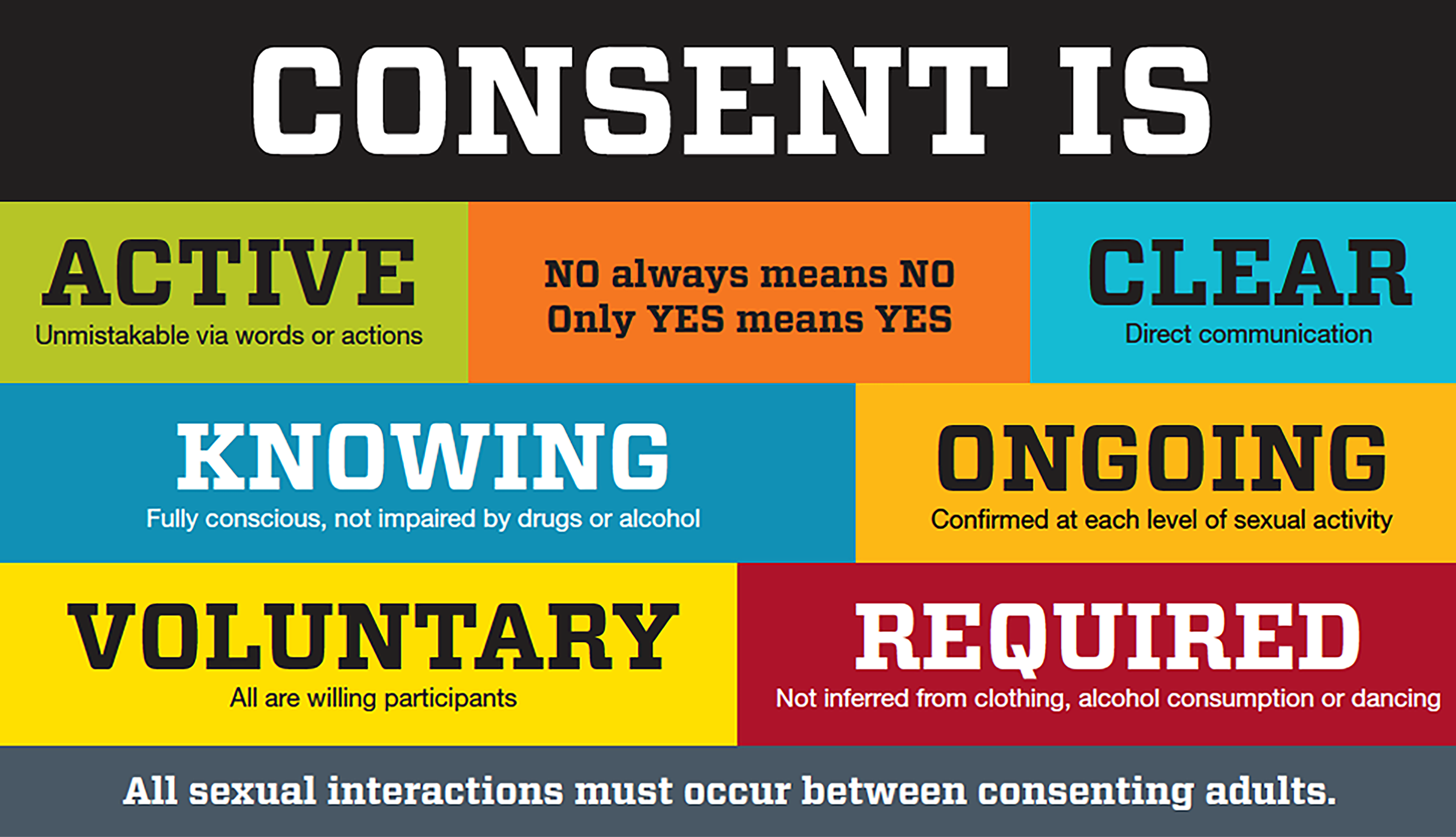 All activities must receive prior consent explicitly by verbal or written agreement rather than through gestures, body language, or past behavior.